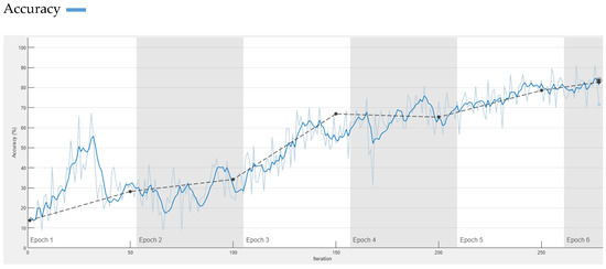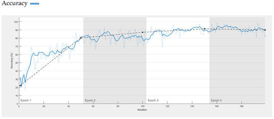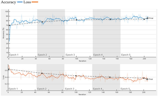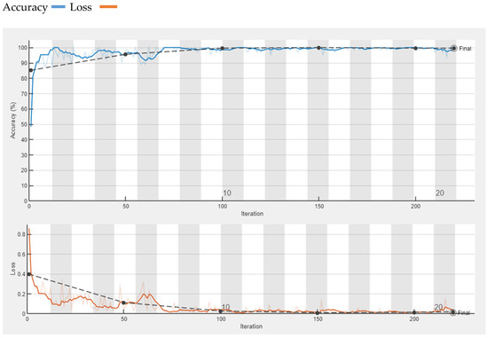 First, 750 images out of 1000 are selected randomly for the training process and 250 are selected for validation of the model. We choose SGD with momentum as an optimizer with an initial-learning rate of 0.01, learn-rate drop factor of 0.2, and learn-rate drop period of 5. Mini-batch size is adjusted to 64 and Max-epoch is 20. The training process of the model with the loss and accuracy of the model observed in MATLAB is presented in Figure 7.