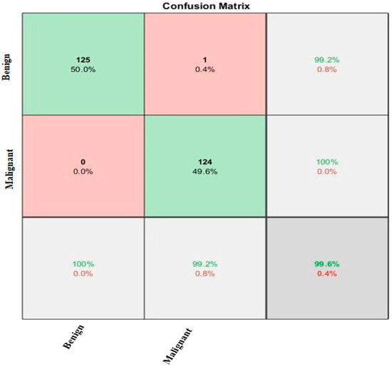 The percentage of all correctly classified images represents the precision of the model [42]. It is observed from the confusion matrix that the proposed CNN provides high accuracy as the diagonal of the confusion matrix has high values in Figure 8. The result of the confusion matrix is also represented in terms of percentage accuracy of both classes, benign and malignant, used in our dataset. In the Figure 8 confusion matrix, there are 125 images of the benign class that our proposed model correctly classified and there was only one case that the proposed model classified as in the benign class but actually the image belonged to the malignant class. Similarly, 124 images were correctly classified by the model as the malignant class, and there was no such case where the proposed model classified it as malignant and the image belong to the benign class. So, it is clearly observed that out of 250 images, 249 images are correctly classified by the model and only one image was not classified correctly by the proposed model.