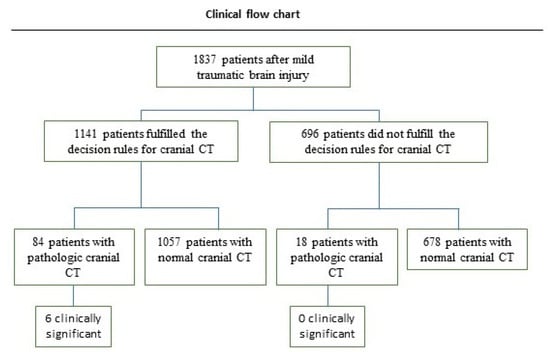 - Arab, A.F.; Ahmed, M.E.; Ahmed, A.E.; Hussein, M.A.; Khankan, A.A.; Alokaili, R.N. Accuracy of Canadian CT head rule in predicting positive findings on CT of the head of patients after mild head injury in a large trauma centre in Saudi Arabia. Neuroradiol. J. 2015, 28, 591–597. [Google Scholar] [CrossRef]