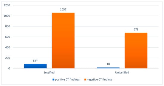 The majority (62.1%) of cranial CT scans included in the sample complied strictly with the guidelines’ decision rules, and 37.8% were not justified and likely avoidable (Table 4). Intracranial lesions were detected in 7.9% of the patients with justified CT scans, and 6 of these patients required neurosurgical intervention. Seventy-three patients received a control CT1 after 8 h. Among the 696 patients with unjustified CT scans, 18 (2.5%) had a pathologic CT0; however, without clinical relevance. A significantly higher incidence of positive cranial CT0 findings was observed in patients with justified CT scans compared with patients with unjustified CT scans (7.9% vs. 2.5%, p < 0.0001) (Figure 3). The distribution of all CT pathologies regarding the guideline’s decision rules is presented in Table 4. Intracranial hemorrhage, subdural hematoma, subarachnoid hemorrhage, contusion hemorrhage, and linear skull fracture were significantly more frequently detected in patients with justified CT scans than in patients with unjustified CT scans (p < 0.05). No significant difference was observed when diagnosing epidural hematoma, depressed skull fracture, open skull fracture, basal skull fracture, and galea hematoma (p > 0.05).