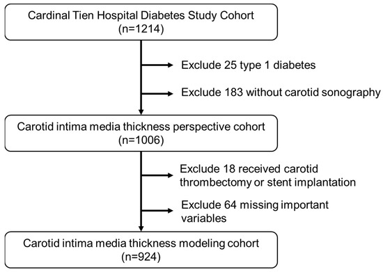 The data for this study were derived from the Diabetic Outpatient Clinic at Cardinal Tien Hospital, noted as the “Cardinal Tien Diabetes Study Cohort (CTDSC)”, in Taiwan from 2013 to 2019. We obtained informed consent from all participants and collected data anonymously. The study protocol was approved by the institutional review board of the hospital. In total, 1214 patients with T2D were enrolled. The inclusion criteria were (1) patients aged between 50 and 75 years old, without renal failure on regular hemodialysis, (2) body mass index (BMI) between 22 and 30 kg/m2, (3) glycated hemoglobin (HgbA1c) between 6.5 and 10.5%, and (4) all participants had a carotid ultrasound examination before the study. After excluding subjects due to various causes, 924 subjects remained for analysis (495 men and 429 women). The flowchart of participant selection is displayed in Figure 1.