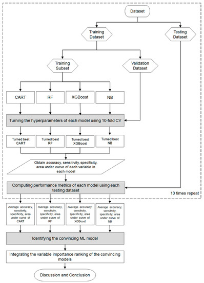 The flowchart of the proposed scheme that combines the four Mach-L methods is demonstrated in Figure 2. In the proposed scheme, we first collected patients’ data to prepare the dataset for model construction. The dataset was randomly split into an 80% training dataset for model building and a 20% testing dataset for out-of-sample testing. In the training process, each Mach-L method has its hyperparameters tuned for constructing a relatively well-performing model. We used a 10-fold cross-validation technique for hyperparameter tuning. To do this, the training dataset was further randomly divided into the training dataset for building the model with a different set of hyperparameters and the validation dataset for model validation. All possible combinations of hyperparameters were investigated by grid search. The model with the lowest root-mean-square error on the validation dataset was viewed as the best model of each Mach-L method. The best models for CART, RF, XGBoost, and NB were generated, and we obtained the corresponding variable importance ranking information.