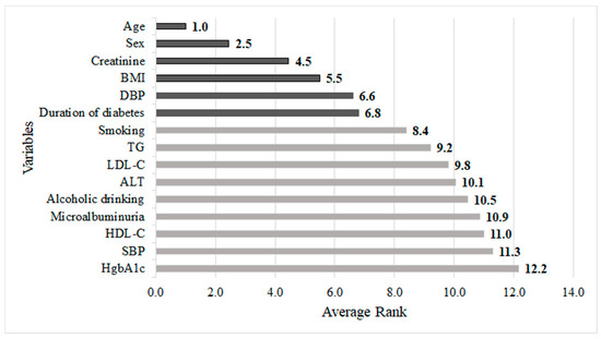 Figure 3 depicts the risk factors based on the increasing order of their average rank values. It can be noted from the figure that the six most important risk factors in predicting abnormal c-IMT in a 4-year-follow-up T2D cohort were baseline age, sex, creatinine, BMI, DBP, and duration of diabetes.