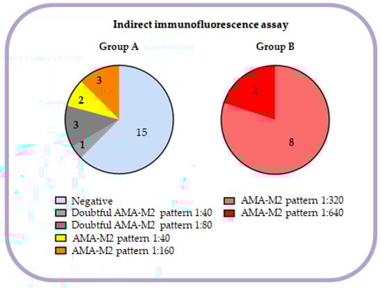 IFA results of patients in our cohort are shown in Figure 1. Clearly positive AMA-M2 results (>1:160) by IFA were obtained in all patients (100.0%) from group B, whereas negative (62.5%), doubtful positive (16.7%) or low positive (20.8%) results were obtained in group A. Only 12.5% of patients in group A were clearly positive. ELISA assay was positive in all patients in both groups, but mean concentration was 68.2 and 129.7 U/mL in group A and B, respectively (p < 0.01). Autoantibodies against 3E2 in DB-E2nonSep were quantified displaying a tendency of higher results in group B (40.0 vs. 208.5; p < 0.01).