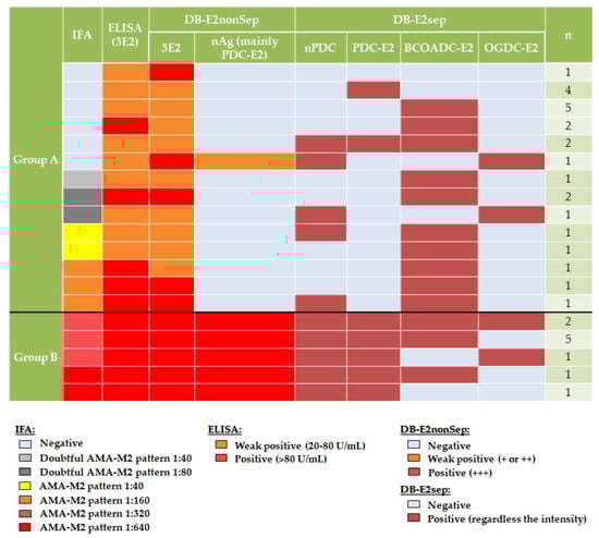 All patients in both groups, except one in group A, had autoantibodies against at least one subunit by DB-E2sep. The only case without autoantibodies in this assay had the following results in routine techniques: negative by IFA, weak positive by ELISA (3E2) (22.8 U/mL) and negative autoantibodies anti-nAg (mainly PDC-E2) and moderate-high positive autoantibodies anti-3E2 by DB (DB-E2nonSep).