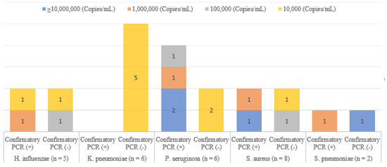 The pathogen detection rate using the PN-panel was significantly higher than the rate using conventional cultures (59.7% vs. 37.3%, p value 0.01). All bacteria (23/23, 100%) detected by conventional cultures were also identified by PN-panels, and 39 additional bacteria were identified by PN-panels alone. The concordance rate was high (20/26) when the bacterial load was high (107 copies/mL), but it was much lower (3/35) when the bacterial load was 104−6 copies/mL, which is in line with a previous study [8]. This might be due to the reporting guidelines for a respiratory culture, which suggest that potential upper respiratory normal flora should be reported when present at high quantities in sputum and when representing predominant growth [7]. Rouby et al. set the threshold for positivity on cultures as 107 CFU/mL for sputum specimens, 104 CFU/mL for BAL, and 105 CFU/mL for endotracheal aspirates [22].