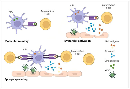 Molecular mimicry is characterized by the presence of epitopes on SARS-CoV-2 spike glycoprotein that cross-react with host antigens leading to the activation of cellular and humoral autoreactivity, due to the similarity to self-epitopes. Bystander activation implies the activation of a non-specific and over-reactive antiviral immune response. This phenomenon leads to the liberation of self-antigens from the damaged tissue and the release of cytokines from the antigen presenting cells (APCs). Self-antigen is then taken up by APCs and presented to T cells. This way, APCs activate autoreactive T cells, exacerbating the tissue destruction. A persistent viral infection can lead to the phenomenon of epitope spreading. In fact, the perpetuation of tissue damage can promote the release of new self-antigens that may activate more autoreactive T cells when taken up by APCs [83].