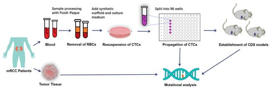 Recent studies have shown that the circulating tumor cell (CTC) is a necessary condition for the invasion and distant metastasis of RCC, which helps to clarify the mechanism of metastasis, guide treatment, and provide important references for judging its efficacy and prognosis [9,10,11]. CTCs refer to a kind of cell in the human body that is separated from the primary tumor focus and enters the peripheral blood circulation system; these cells circulate with the blood and can form new metastasis lesions after being separated from the blood circulation [12]. After entering the blood circulation, some CTCs can escape from the immune surveillance and finally enter the microenvironment of other organs. A small number of CTCs separated from the blood circulation can safely pass the quiescent period and eventually form new metastatic lesions under the action of various cytokines [13,14]. However, few CTCs-related gene mutations have been developed which could promote metastasis and the implantation of RCC patients.