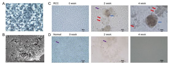 Successful proliferation of CTCs in primary diagnosed mRCC. (A) Synthetic scaffold morphology observed by light microscopy; (B) Synthetic scaffold morphology observed by electron microscopy; (C) Representative phase contrast microscopy images of CTCs from mRCC patients were taken on the first day of culture, day 14 and day 28. The blue arrow indicates circulating tumor endothelial cells (CTECs) which can self-assemble and proliferate into spheres. The red arrow indicates that CTCs attach and proliferate around the endothelial cell spheres. The purple arrow indicates that the leukocytes in the blood then become gradually apoptotic. Scale bars, 50 μm; (D) Representative phase contrast microscopy images of healthy subjects were observed in the same way. Under this culture condition, no cells survived in healthy subjects, and residual leukocytes also became gradually apoptotic within 30 days. The purple arrow indicates that the leukocytes in the blood then become gradually apoptotic. Scale bars, 50 μm.