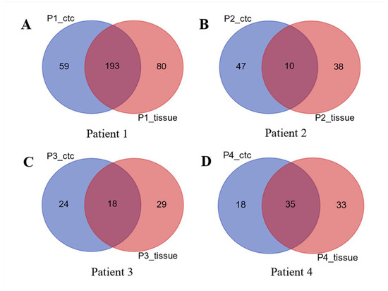 The results showed that both CTCs and tissue type-specific mutated genes were more significantly different; 193 mutated genes shared by Patient1_CTC and Patient1_tissue (Figure 3A); 10 genes shared by Patient2_CTC and Patient2_tissue (Figure 3B); and there were 18 and 35 shared genes for patient 3 (Figure 3C) and patient 4 (Figure 3D), respectively.