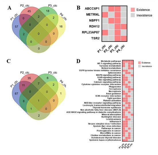 Venn diagrams were used to count the similarities and differences between CTCs type mutation genes in the four samples. From the above CTC differential quantity genes (P1_CTC, P2_CTC, P3_CTC, P4_CTC) we screened out 59, 47, 24 and 18 mutated genes (A). Among them, cluster analysis showed ABCC6P1 and NBPF1 shared by P2_CTC and P3_CTC, METRNL and RPL23AP87 shared by P1_CTC and P3_CTC, RDH12 and TSR2 shared by P3_CTC and P4_CTC (B). Venn diagrams were used to count the similarities and differences in the KEGG pathway for the specific mutated genes mentioned above. Individual differences in the pathways were also significant. From the KEGG analysis (P1_CTC, P2_CTC, P3_CTC, P4_CTC) we screened out 90, 58, 25 and 7 pathways (C). Among them, cluster analysis showed metabolic pathways shared by P1_CTC, P2_CTC, P3_CTC and P4_CTC, HIF-1 signaling pathway shared by P1_CTC, P3_CTC and P4_CTC. MAPK signaling pathway and ErbB signaling pathway were also present in the CTC type data pathway in the present four samples (D).