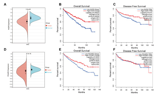 KAZN was highly expressed in normal tissues compared with tumor tissue in the TCGA-KIRC cohort (p = 3.3 × 10−45) (A). Survival analysis showed that high expressions of KAZN had a significantly worse overall survival (OS) rate (p = 0.00023) (B) and disease-free survival (DFS) rate (p = 0.015) (C) compared to patients with low expressions of KAZN. POU6F2 was also highly expressed in normal tissue compared with tumor tissue (p = 9.7 × 10−16) (D) and patients with high expressions of POU6F2 had a significantly worse overall survival (OS) rate (p = 0.0032) compared to patients with low expressions of POU6F2 (E), but this was not statistically significant in DFS (F).