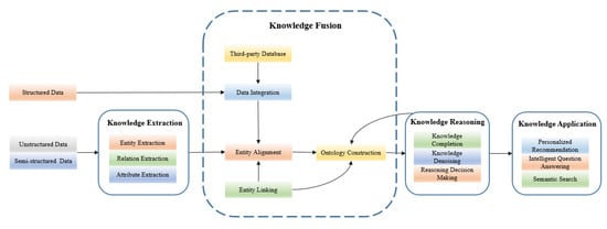 Knowledge extraction: This process involves extracting entities, relationships, and attributes from multi-source heterogeneous data. Traditional rules, machine learning, and deep learning methods are often used to extract the required knowledge. Currently, the most popular method is CNN [], which extracts lexical and sentence features for knowledge extraction. Socher et al. [] used RNN to obtain vector features of sentences, which improved the performance of relation extraction. Zhang et al. [] proposed a Bi-LSTM method to obtain information between words for relation classification.