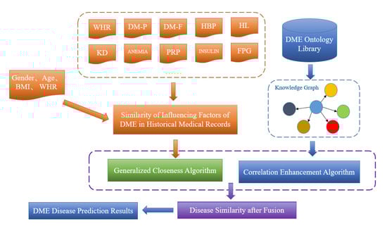At present, there is a lack of research on disease prediction models in the field of DME, and the development of a DME disease prediction model is of great significance for the early screening of a high-risk population. In this context, this study used knowledge graph technology to implement clinical auxiliary disease prediction functions to meet clinical needs. The clinical data collected by the Tianjin Medical University Eye Hospital were used as the research object, and a DME disease prediction model based on the knowledge graph [] was proposed. By comprehensively analyzing the different influencing factors, the model was able to obtain the incidence probability of a DME disease.