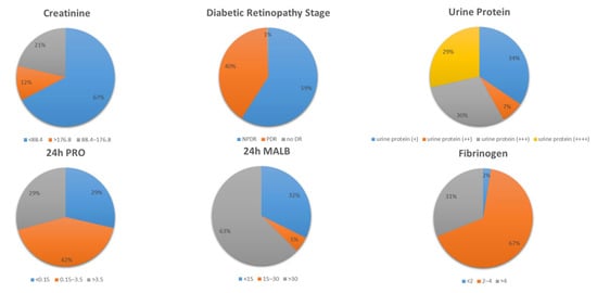 After data processing and data analysis, the top six influencing factors with the highest weights in the DME data were Scr, DR, urine protein, 24 h PRO, 24 h MALB, and FIB. The statistical results are shown in Figure 5.