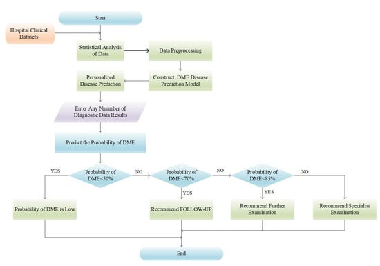 In this study, the proposed DME disease prediction model comprehensively evaluates disease probability based on basic clinical data, disease history, medical test results, and other factors, resulting in a clinical decision support system for disease prediction visualization []. This system is useful in promoting and applying the disease prediction model in clinical practice. The study plans to collect more clinical objective data in the future to update the model and further improve its accuracy of disease prediction. Additionally, this study’s findings can serve as a reference for the prediction of other major clinical diseases such as hypertension, diabetes, coronary heart disease, and others, providing support for early disease screening and intervention. Furthermore, the model can offer decision-making technical support for TCM syndrome differentiation, disease diagnosis, disease treatment, and physical identification.