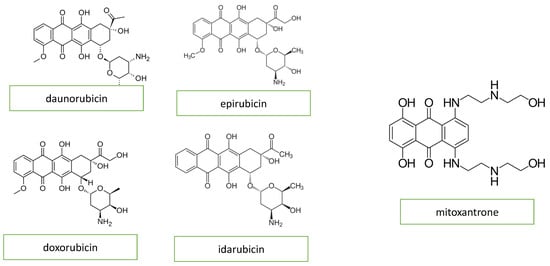 Anthracyclines, primarily doxorubicin but also daunomycin, epirubicin, and idarubicin, are some of the most commonly used agents for both hematologic and solid tumors. The basic structure of anthracyclines is that of a tetracyclic molecule with an anthraquinone backbone connected to a sugar moiety by a glycosidic linkage (Figure 1).