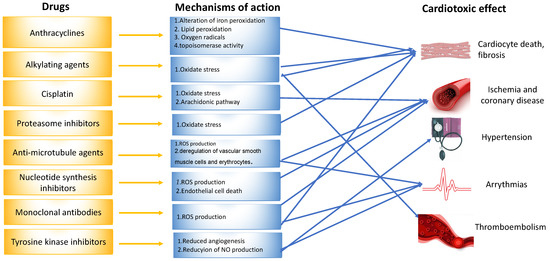A multivariable number of factors contribute to the onset of cardiotoxicity with regard to the patient and/or the administered therapy (Figure 7). Several types of chemotherapeutic drugs may cause cardiotoxicity, as referred to above. These drugs act on cancer cells through a variety of mechanisms and promote cardiotoxicity with distinctive clinical symptoms and underlying mechanisms (Table 1) [7,10,16].