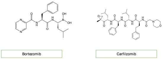 A new therapeutic option for the treatment of acute lymphoblastic leukemia (ALL) includes proteasome inhibitors (Figure 6) [18,20]. Bortezomib and carfilzomib are two newly prescribed drugs with the potential to cause cardiac dysfunction [22]. Compared to carfilzomib (up to 25%), bortezomib has a lower incidence of heart failure (up to 4%). The pathogenesis of proteasome inhibitor cardiotoxicity is not currently well understood. Exposure to proteasome inhibitors in a prenatal mouse model has shown that they can induce oxidative stress, leading to myocardial dysfunction. Carfilzomib is also known to induce renal toxicity and microangiopathy as a consequence of endothelial dysfunction. Combining these studies reveals a complicated mechanism of cardiotoxicity linked to proteasome inhibitors, including alterations to the heart’s muscle and vasculature, which may be more severe with carfilzomib than bortezomib due to the irreversible nature of the proteasome inhibition of carfilzomib [23,24].