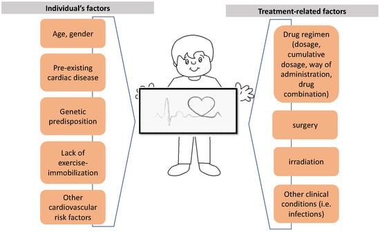 In addition, female gender, age (under <5 years old), the patient’s clinical condition (extent of disease, infection), genetic background, pre-existing cardiac disease, and the combinations of cardiotoxic drugs play an important role in causing cardiac damage [33] (Table 2). The pediatric population is more homogeneous as a study population since there are no confounding cardiovascular risk factors (diabetes, smoking, arterial hypertension) [7,14,34].