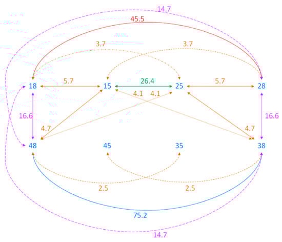 Model-based estimates of odds ratios that describe the strength of the association between the congenital absence of PM2 and M3 in the analyzed group of patients. Only the estimates that are significantly different from 1 are presented. The coloured lines show the odds ratio between the specific pairs of teeth. Example: the odds of M3 agenesis in the maxilla increased 45.5 times when the other M3 in the maxilla was missing; the odds of agenesis of M3 in the maxilla increased 16.6 times when M3 was missing on the same side in the mandible.