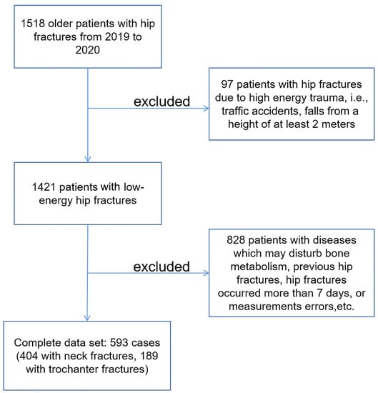 - Li, M.; Lv, H.C.; Liu, J.H.; Cui, X.; Sun, G.F.; Hu, J.W.; Zhang, L.C.; Tang, P.F. Differences in Bone Mineral Density and Hip Geometry in Trochanteric and Cervical Hip Fractures in Elderly Chinese Patients. Orthop. Surg. 2019, 11, 263–269. [Google Scholar] [CrossRef] [PubMed]