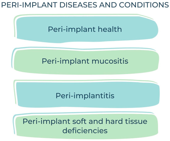 The latest World Workshop (2017) on the Classification of Periodontal and Peri-Implant Diseases and Conditions clearly separated peri-implant mucositis and peri-implantitis as the two categories of peri-implant diseases [36,37] (Figure 1).