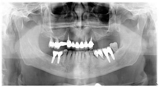 Radiographic examination was performed on orthopantomograms (e.g., Figure 1 and Figure 2). The dental software Instrumentarium CliniviewTM (Palodex Group Oy Nahkelantie 150, Tuusula, Finland) was used for taking and importing digital radiographs which were analyzed on a large (24′) computer screen. The distance from the implant shoulder to the alveolar bone crest was measured in millimeters at the mesial and distal aspects using the software’s measuring tools [59]. A bone-loss mean value per patient was calculated using the mesial and distal measurements resulting from the crestal bone level (CLB). The mean value per patient of the marginal bone level (MBL) was calculated by measuring, on radiographs, the distance between the CEJ/restoration margin—radiographic bone level at mesial and distal site of each tooth. Unaffected implants were considered implants with the bone level reaching the implant shoulder both on mesial and on distal sites, as viewed on radiographs. Minimally affected implants were considered implants in which the bone level reached one millimeter below the implant shoulder, as viewed on the radiographs (Figure 2 and Figure 3).