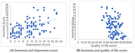 The graphs show the statistically significant positive correlation between the scores of the insomnia scales with that of depression (r = 0.53, p < 0.01) (A), together with a statistically significant negative correlation between the insomnia score with that of quality of life (r = −0.39, p < 0.05) (B).