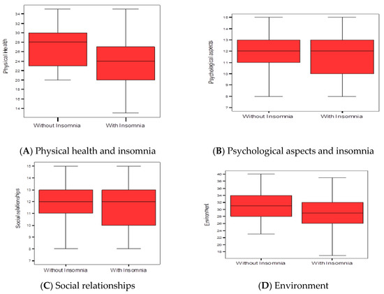 Relationship between insomnia using dimensions of the quality of life scale. (A) Physical health, score without insomnia 27.2 ± 3.9 vs. with insomnia 24.0 ± 5.2, p < 0.001. (B) Psychological aspects, score without insomnia 23.4 ± 3.0 vs. with insomnia 21.1 ± 4.6, p < 0.01. (C) Social relationships, score without insomnia 12.1 ± 1.9 vs. with insomnia 12.0 ± 1.9, p > 0.05. (D) Environment, score without insomnia 31.0 ± 4.4 vs. with insomnia 29.0 ± 4.8, p < 0.05. Student’s t-tests.