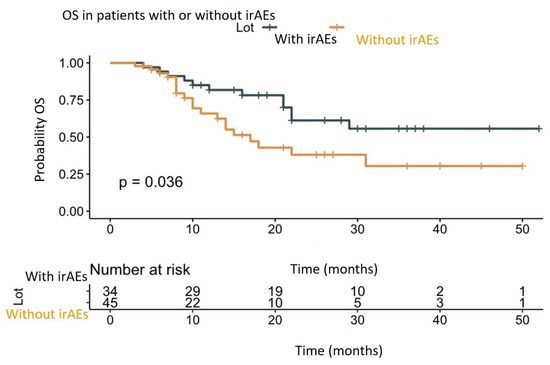 In order to determine if the occurrence of irAEs has a potential role in prolonging OS, we divided the patients into two groups. One group consisted of patients who presented irAEs (n = 34), and the other was of patients without irAEs (n = 45). In our study, the RMST and events (deaths) percentage were in favor of the patient that presented irAEs (long-rank test, p = 0.036). The results are shown in Figure 3.