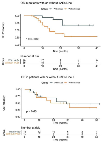 OS in patients with or without irAE. Legend: OS—overall survival; irAEs—immune-related adverse events.
