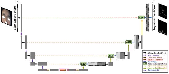 If zero-padding is the process at the input stage, attention mechanisms can improve the segmentation performance inside the neural network. The first attention mechanism was proposed in natural language processing to mimic human attention processes [23]. Attention allows the network to selectively focus on the target parts of an input while processing. In the proposed method, spatial attention and additive attention modules were proposed to emphasize processing at the target location. More details are discussed in the following subsection.