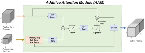 where , and v represent , , and , respectively. Here, denotes the activation function. In [11], additive attention was applied as the “attention gate”. Additive attention was used in this study, and we suggest the additive attention module (AAM), as in the green box in Figure 3 and described in detail in Figure 4.
