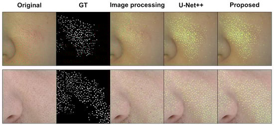 Figure 6 displays the results of pore detection on the left cheek area in the butterfly zone. The two rows represent two types of data. The third column of Figure 6 details the result of an image processing approach [3]. To implement the idea, high-frequency component extraction, k-means clustering, and morphological processing were applied one after the other. Therefore, most pores are detected well, but other high-frequency structures other than pores are also detected. The fourth and fifth columns detail the results of U-Net++ and the proposed network, respectively. Deep-learning-based methods demonstrate pore distribution that is similar to the GT.