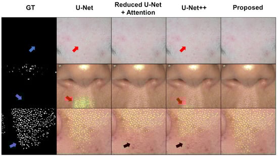 The first row of Figure 7 reveals that the U-Net and U-Net++ detect the pores between eyebrows. Although they may appear as pores in a local area, a human annotator may not consider this during labeling because the area is in the T zone. No labels are visible in this area, as observed in the GT, as indicated by the blue arrow. By contrast, the reduced U-Net with attention and the proposed network do not detect these pores. The second row also exhibits a similar trend. The U-Net detects unwilling pores under the nose, as indicated by the red arrow. Although not as much as U-Net, U-Net++ also exhibits some degree of false positives. The remaining two models, the reduced U-Net with attention and the proposed one, do not detect false positives.