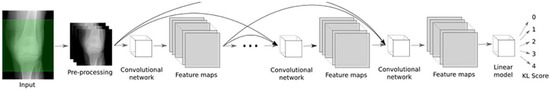 With the advancement in deep learning architectures, new methodologies for OA severity assessment are introduced. A variety of deep-learning models have been proposed in the literature for diagnosing the severity of knee OA. For example, Ref. [30] leveraged a fully convolutional network (FCN) to locate knee joints and a deep convolutional neural network (CNN) to differentiate various stages of knee OA severity. Likewise, Ref. [31] introduced a technique using deep Siamese CNNs for automatic grading of knee OA severity following the KL grading scale, treating knee OA as a multi-class problem based on KL grades. Moreover, Ref. [32] presented a Discriminative Regularized Auto-Encoder (DRAE) for the early detection of knee OA, specifically differentiating between non-OA and minimal OA. The DRAE combines a discriminative loss function with the standard auto-encoder training criterion to improve the identification of knee OA.