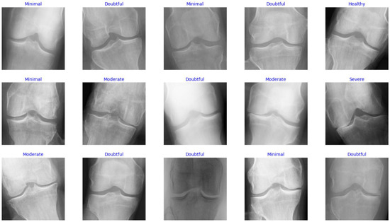 In this study, the Knee Osteoarthritis Severity Grading dataset is used to train and evaluate the performance of the proposed model. It contains knee X-ray images for OA detection and KL grading. Five gradings constitute the dataset labels as follows: healthy knee image (grade 0), doubtful joint space narrowing (JSN) with possible OA (grade 1 or healthy), confirmed OA and possible joint space narrowing (grade 2 or minimal), multiple moderate OA with confirmed JSN and mild sclerosis (grade 3 or moderate), and large OA with significant JSN and severe sclerosis (grade 4 or severe). The data are distributed based on the grades, such that there are 604 images for grade 0, 275 images for grade 1, 403 files for grade 2, 200 images for grade 3, and 44 images for grade 4. Figure 2 shows samples of images with various labels.