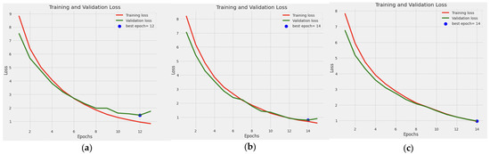 Figure 3 shows the training and validation performance of the model for the three-class tasks (5-class (a), 3-class (b), and 2-class (c)) over the training epochs. It also shows the best fit where the training and validation curves intersect. It can be observed that the loss decreases in both the training and validation sets when the number of epochs increases. In the three classification tasks (i.e., five-class, three-class, and two-class classification), it can be noticed that the training loss was higher than the validation loss at the early epochs. While the training loss continues to decrease at the late epochs during the five-class training (3:a), the validation loss curve tends to flatten, which indicates that the loss does not improve by increasing the epochs. However, during the three-class and two-class classifications, both the training and validation losses overlap most of the time. The loss curves also show the effect of the adaptive early stopping technique as the training stops at 12 epochs (five-class), 13 epochs (three-class), and 14 epochs (two-class) when the model detects no more improvement on the validation set.