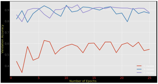 Figure 4 shows the comparison between five-class classification, three-class classification, and the binary classification that we conducted using our proposed model. The results were taken after each epoch using the validation set. It can be observed that the binary classification achieved the highest accuracy, while the accuracy of the five-class classification was the lowest. Moreover, it can be observed that the training accuracy increases when the number of epochs increases, until the number of epochs reaches 25, where we can see that the increase becomes less gradual. Furthermore, the comparison shows that the validation accuracy was not stable and oscillated around 0.6. This indicates that the data with five-class labels negatively affect the accuracy when new data are introduced to the model. The reason behind this drop in the model’s accuracy could be the overlapping between the class boundaries, which makes it difficult for the model to distinguish between the characteristics of those classes. The high training accuracy confirms such claim as the model overfits the training examples. In contrast, the validation accuracy for three-class classification and binary classification increased to around 0.9. This means that the model performed well when the target label was less granular but dropped when the labeling became more specific. This could be due to the inability of the model to explore discriminative features that represent the fine granular labels (the five-class case). One potential solution is to embed an attention layer as a feature selection mechanism into the model structure so that it can focus on a set of features relevant to the target classes.