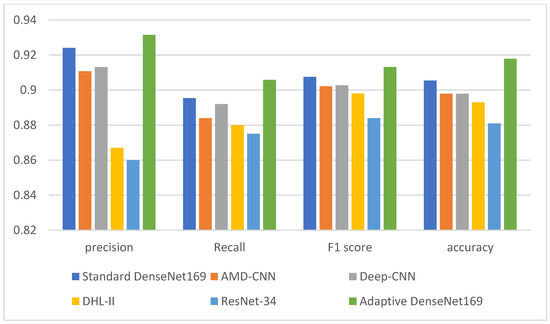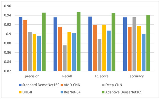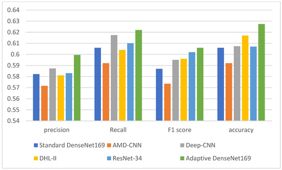 Table 5, Table 6 and Table 7 show a comparison between the proposed adaptive DenseNet169 model with the results of existing works. The comparison is also visualized in Figure 5, Figure 6 and Figure 7. The comparison was conducted between the proposed adaptive DenseNet169 and the standard DenseNet169. We also compared the performance of the proposed model with the existing studies related to pre-trained models for knee OA detection with early stopping capabilities, namely, AMD-CNN [13], deep CNN [24], DHL-II [35], and ResNet-34 [29]. In this comparison, we used several metrics, namely, precision, recall, F1 score, and accuracy. By comparing the results obtained from our model with those obtained by related works, it can be observed that the proposed model outperformed the previous models in terms of accuracy, recall, and precision. In the comparison, the proposed model as well as the models developed by existing works were trained using the same number of epochs. In our model, the adaptive early stopping was applied at a batch level, in which the model aborts the training of the respective epoch if new instances have little or no contributions to improving the validation accuracy.