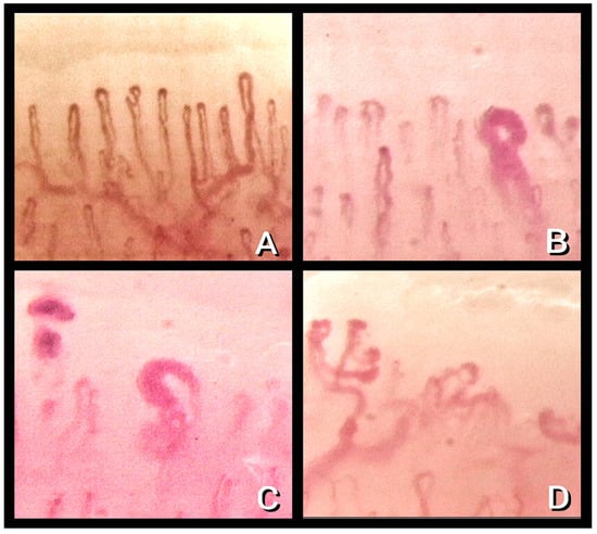 Nailfold video capillaroscopy images (×200) in healthy subjects (A) and “early” (B), “active” (C), and “late” (D) patterns of scleroderma microangiopathy (Operators: S. T., L. R., B.R. and L. M.).