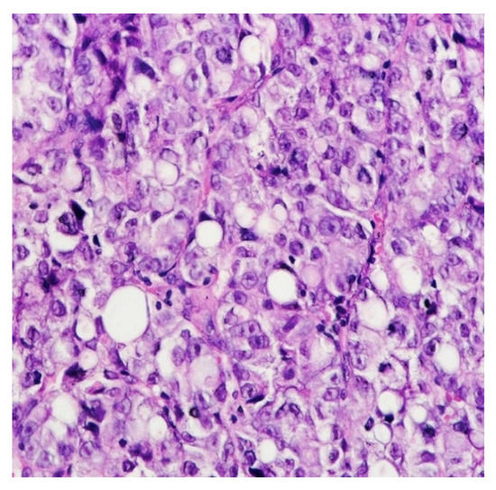 In the general population, the main histological subtypes of gastric carcinoma are the intestinal (54%) and diffuse (32%) types; the remaining 10–12% are considered rare and indeterminate (Figure 1). In pregnant women, the most common type is diffuse [34]. The main patterns of histological development (WHO 2010) are tubular and papillary but also mucinous, including “signet ring” or rare variants (adenosquamous carcinoma, squamous carcinoma, hepatoid adenocarcinoma, carcinoma with lymphoid stroma, choriocarcinoma, etc.) (Figure 2) [35]. The two well-known types of tumor development with a prognostic and treatment role are early gastric carcinoma and advanced cancer.