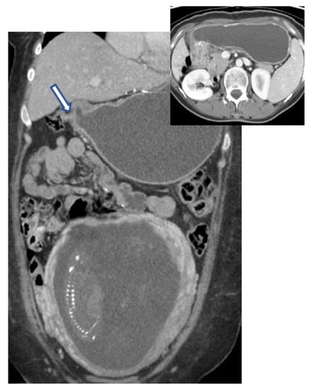 If CT can be useful for a diagnosis, especially of a major complication, or as a therapeutic guide, the practitioner should not hesitate to use it, as the life of the mother prevails over the fetus's prognosis. What can CT bring in terms of evaluating neoplasia in pregnancy? Firstly, the method allows for a three-dimensional evaluation of the relationships between the tumor and adjacent structures. Secondly, the assessment and demonstration of complications that are not apparent or lead to a poor prognosis of the mother in the absence of a clear or obvious diagnosis put her life in immediate danger, especially in the absence of a quick and effective treatment (perforations, pyloric obstruction) (Figure 4). Thirdly, CT is used for disease staging. After initial enthusiasm, in which CT was credited with an accuracy of 85–90% in the assessment of the T index from TNM staging, rigorous studies have shown a much lower rate, between 50 and 70%, depending on the stage of the cancer [66,67].