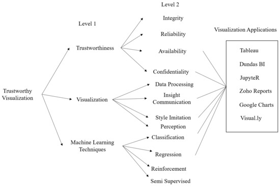 Figure 2 represents the basic structure of trustworthy visualization, which is further divided into Level 1′s three attributes: trustworthiness, visualization, and machine learning techniques. The hierarchy is further divided into Level 2, which consists of the sub-attributes of trustworthiness, visualization, and machine learning techniques, respectively. For selecting the best alternative available according to the given attributes, we have taken six popular medical data visual analytics tools based on different machine learning algorithms, which are Tableau, Dundas BI, Jupyter, Zoho Reports, Google Charts, and Visual.ly [4]. The details of each attribute and sub-attribute from Level 1 and Level 2 are as follows.