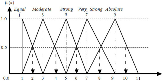 The fuzzy AHP practice expands Saaty’s idea of AHP by combining it with fuzzy set theory [34,35]. In fuzzy AHP, fuzzy scales are used to illustrate the comparative intensity of the various criteria’s contributing components. A fuzzy decision matrix can be created as a result. Fuzzy quantities are also used to embody the final scores of alternatives [34]. Applying particular algebraic operators to the fuzzy integers yields the optimal solution. In this way, these fuzzy integers show all of the parts of the weight vectors and the judgment matrix.