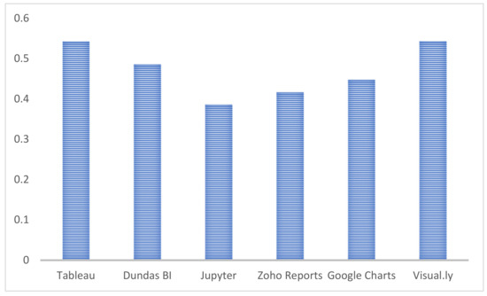 The fuzzy-based AHP technique was used to find the defuzzified and normalized weights of each characteristic, and the fuzzy TOPSIS method was used to make a global ranking of competing options. We collected the technological inputs for six visual analytics tools (Tableau 2019.2 version, Dundas BI, Jupyter, Zoho Reports, Google Charts, and Visual.ly) using the standard scale in Table 4 and Equations (1)–(3) from the Section 2.3. In a fuzzy environment, the weights of attributes found by the fuzzy method and AHP were specified for the TOPSIS technique to find a different ranking. In Table 7, a normalized fuzzy decision matrix for six different and competitive alternatives is generated with the aid of Equations (4)–(7) and provided. The normalized fuzzy decision-matrix cell values (performance values) were multiplied by each attribute weight value using Equations (8) and (9), and a weighted fuzzy normalized decision-matrix was created, as shown in Table 8. The calculations are displayed in Table 9 and Table 10 after applying Equations (10) and (11) to determine the positive and negative idealness of each alternative with regard to each attribute. The final results are displayed in Table 11 and Figure 4 after using Equation (12) and computing the relative closeness score for each alternative. As a result, Visual.ly, which has an efficiency score of 0.5436 among the various alternatives, was determined to be the most effective among the six compared options.