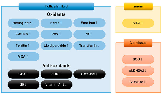- Nakagawa, K.; Hisano, M.; Sugiyama, R.; Yamaguchi, K. Measurement of oxidative stress in the follicular fluid of infertility patients with an endometrioma. Arch. Gynecol. Obstet. 2016, 293, 197–202. [Google Scholar] [CrossRef]