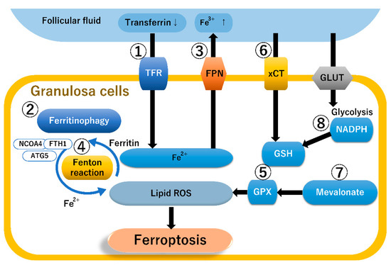 - Ni, Z.; Li, Y.; Song, D.; Ding, J.; Mei, S.; Sun, S.; Cheng, W.; Yu, J.; Zhou, L.; Kuang, Y.; et al. Iron-overloaded follicular fluid increases the risk of endometriosis-related infertility by triggering granulosa cell ferroptosis and oocyte dysmaturity. Cell Death Dis. 2022, 13, 579. [Google Scholar] [CrossRef]