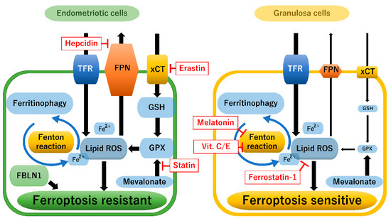 - Li, Y.; Zeng, X.; Lu, D.; Yin, M.; Shan, M.; Gao, Y. Erastin induces ferroptosis via ferroportin-mediated iron accumulation in endometriosis. Hum. Reprod. 2021, 36, 951–964. [Google Scholar] [CrossRef]
